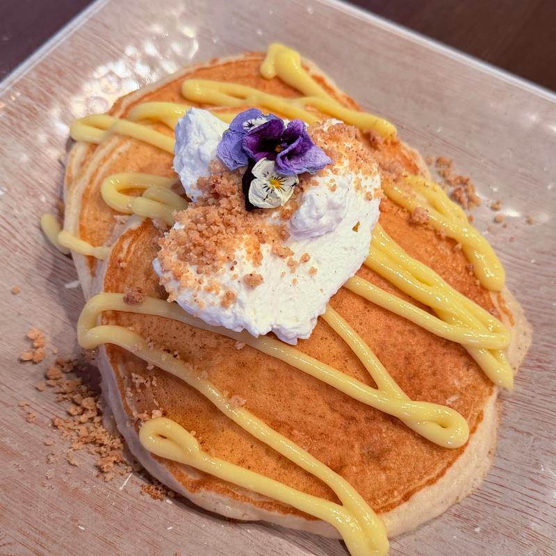 Buttermilk pancakes, topped with lemon cream, cardamon whipped cream and almond streusel